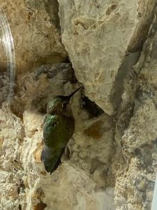 Anna’s hummingbirds are year-round co-habitants where I live. The males have bright iridescent head feathers that flash like strobe lights from the tops of trees that we planted 30 years ago. They can be fiercely protective of particular feeders, so I put up several to make sure that males and females all have access to one! From the stone front on our house, they gather spider web for their nests, feed on small insects, and occasionally rest in the shade. They drink at pools of water in our garden and are the first pollinators of Spring flowers. We have a reciprocal relationship.